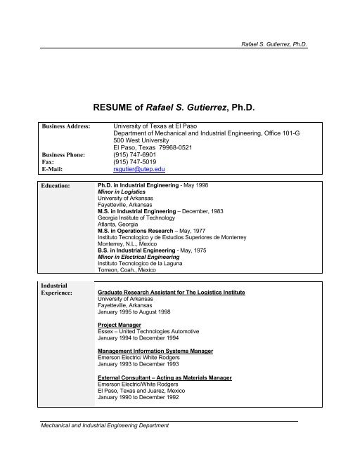 Resume Of Rafael S Gutierrez Ph D Faculty Utep Edu University